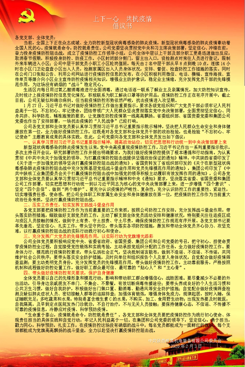 新年伊始,新型冠狀病毒感染的肺炎疫情在全國各地相繼蔓延。為科學、有效應對疫情,切實保障核昌公司全體職工及二一〇小區廣大業主們的身體健康和生命安全,核昌公司全員緊鑼密鼓、有...
