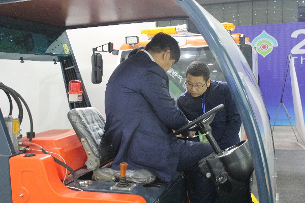 核昌公司展位的精心布置和出色的產品設計吸引了廣大參展客商駐足觀看,客商們不但可以觀看清掃車實地操作視頻,還可以通過與工作人員互動去了解產品性能,展會現場氣氛十分熱烈。