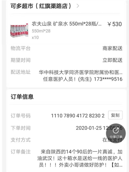 1月23日,疫情蔓延呈上漲趨勢,武漢“封城”后物資匱乏,各地各鎮府人民紛紛送去了物資力量,中陜核集團核昌黨委工作部幾位青年們亦立即行動起來,通過朋友圈、微信群、QQ群等渠道,組織號召朋友、家人參與進來,開展捐款購買礦泉水活動,送往武漢華中科技大學同濟醫學院附屬協和醫院金銀湖分院,大家快速行動,活動共捐助10箱280瓶礦泉水。小小的280瓶,帶著核昌青年及家人朋友對武漢同胞的祝福、對全體一線奮戰醫務人員的敬意、對國家抗擊疫情成功的信心前去抗疫一線,這份小小的力量有我們大大的祝福,希望能幫到他們,盼望正在一線奮斗患者和醫務人員都能平安歸來。
