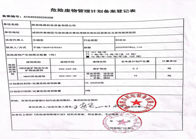 我公司屬機電一體化、機械加工等產(chǎn)業(yè)的生產(chǎn)及經(jīng)營活動, 現(xiàn)階段主要的危險廢物包括:油漆桶、廢機油、乳化液、噴漆、噴砂。油漆桶、廢機油、乳化液等危險廢物處置由陜西明瑞資源再生有限公司承接轉(zhuǎn)運及處理危廢;噴漆、噴砂房等由公司投入大量資金進行升級改造,在經(jīng)營活動中加強職工環(huán)保培訓(xùn),不斷提升職工環(huán)保意識。經(jīng)陜西格林秦灃環(huán)保科技有限公司監(jiān)測,所排廢氣均達到國家標準。為改善環(huán)境、大氣質(zhì)量作出積極的貢獻。